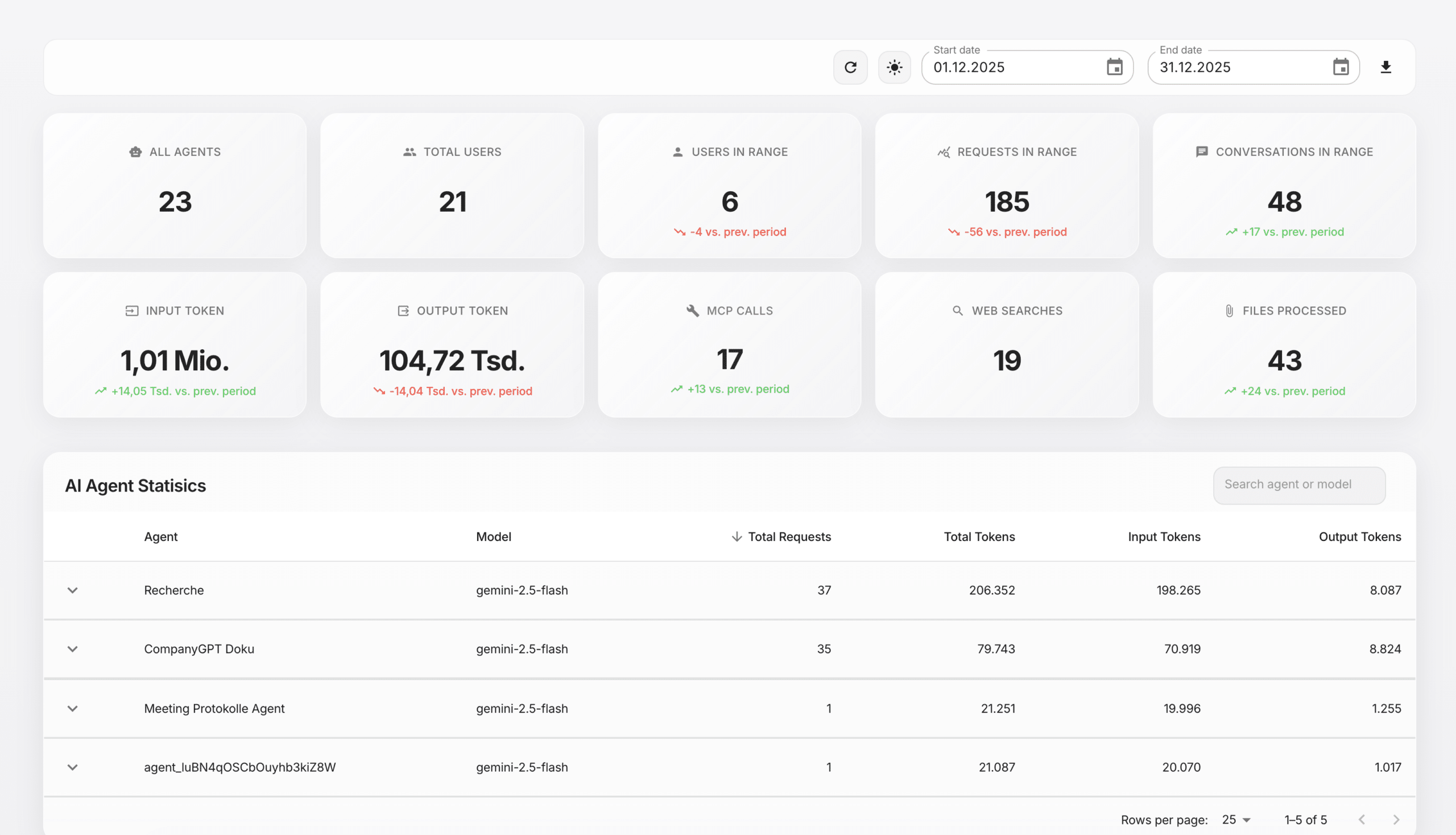 • Die Wahrheit liegt in den Agenten: Die Tabelle „AI Agent Statistics“ ist das Herzstück der Analyse. Hier sehen Sie schwarz auf weiß, welche Agenten den größten Wert stiften. Im Beispiel dominieren die Agenten „Recherche“ und „CompanyGPT Doku“ mit 37 bzw. 35 Aufrufen. Andere, wie der „Meeting Protokolle Agent“, werden kaum genutzt. Das sind unbezahlbare Informationen! Sie können nun gezielt die populären Agenten bewerben, Schulungen für weniger genutzte Tools anbieten oder deren Funktionalität hinterfragen.