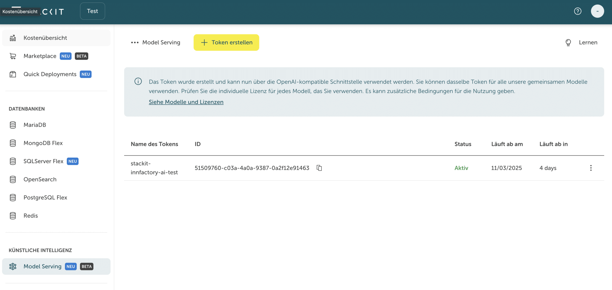 - API-Schlüssel von STACKIT: Sie benötigen einen gültigen API-Schlüssel von STACKIT, den Sie in Ihrem Konto generieren können. Als STACKIT Partner unterstützt Sie die innFactory gerne beim Onboarding.