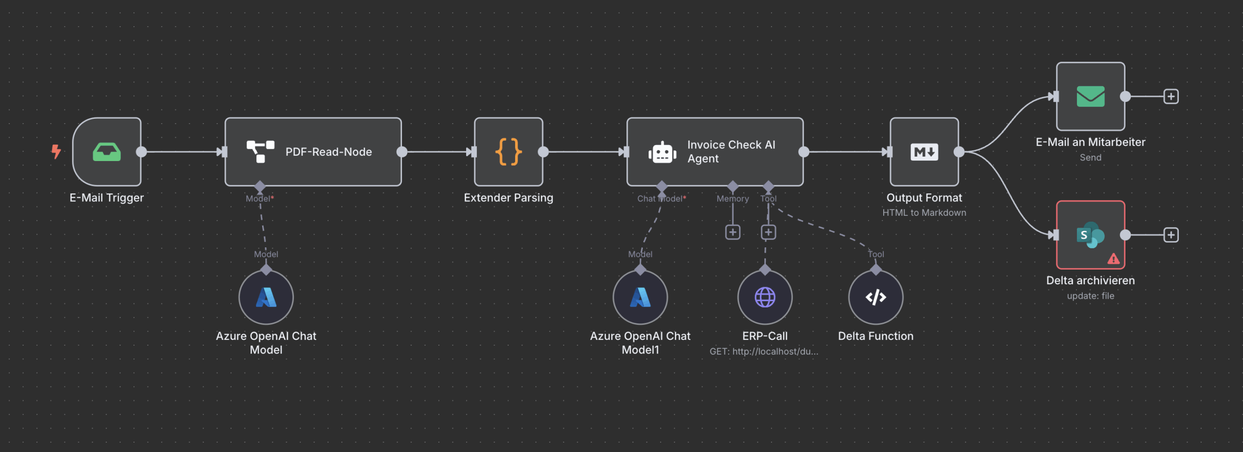 Szenario: Ein Unternehmen erhält regelmäßig PDF-Rechnungen per E-Mail. Diese Rechnungen sollen automatisiert verarbeitet, deren Positionen (z.B. Artikel, Preise, Mengen) zuverlässig extrahiert und anschließend mit den Daten eines zugehörigen Angebots aus dem ERP-System verglichen werden. Am Ende erhält der zuständige Sachbearbeiter einen Delta-Report, also eine Liste der Abweichungen, die geprüft werden müssen.